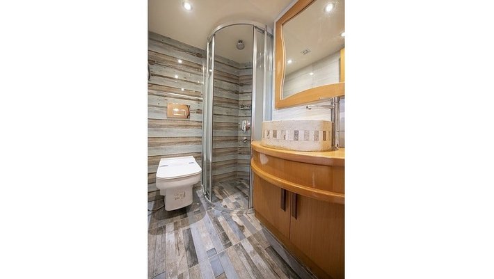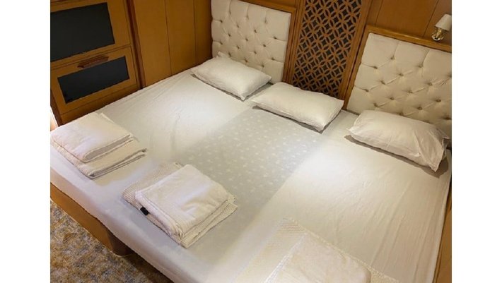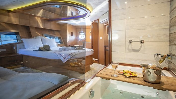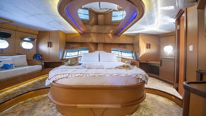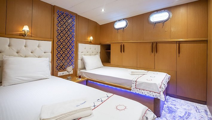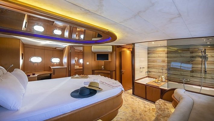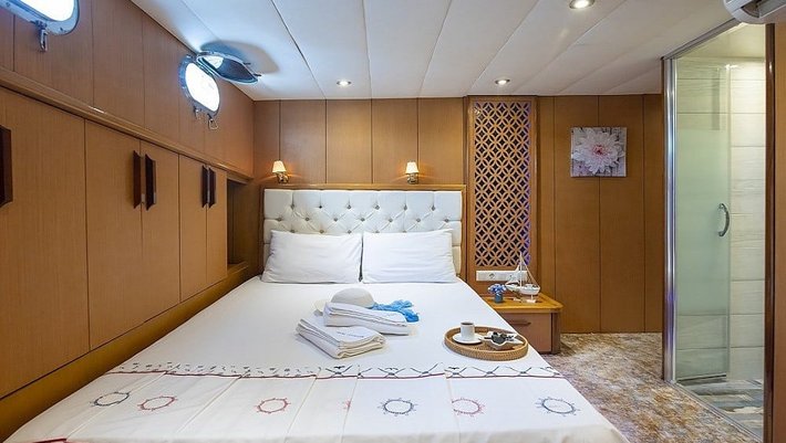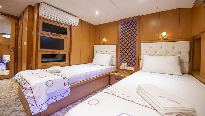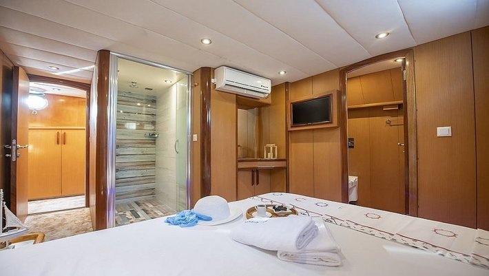 4 cabinas : 2 Master, una de ellas con jacuzzi y 2 dobles con camas individuales que se pueden convertir en camas dobles. Baño en cada camarote y aire acondicionado