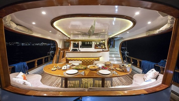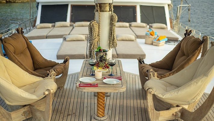 Amplia zona en popa con mesa y sillas para 8 personas