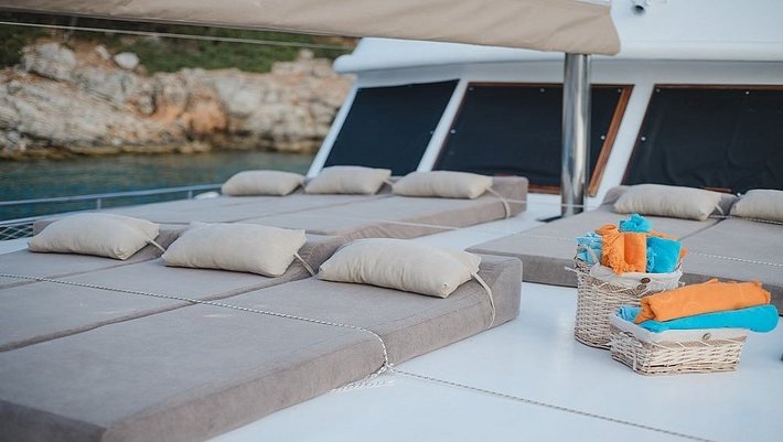 Amplio solarium en proa con 8 colchonetas
