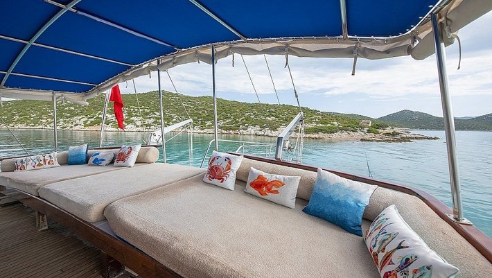 El solarium con colchonetas se encuentra en la proa del barco, asi como un banco con mesitas, ideal para tomar el aperitivo.