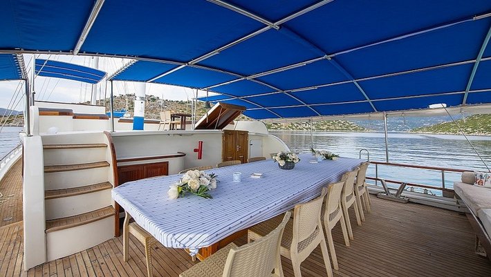 En la zona de popa dispone de un comedor y gran sofá. Tambien dispone de otra comedor exterior mas fresco en la cubierta superior.