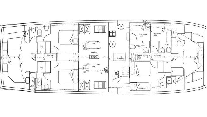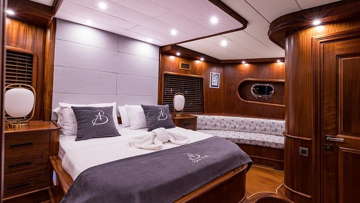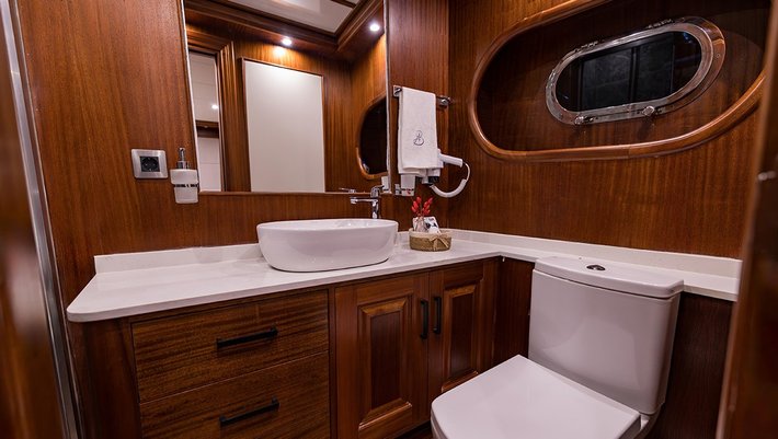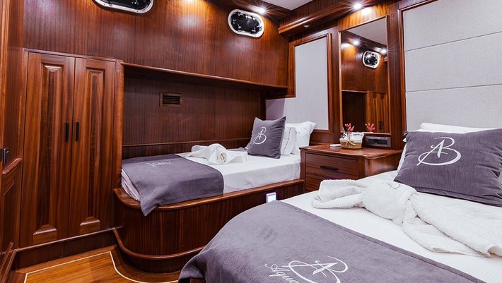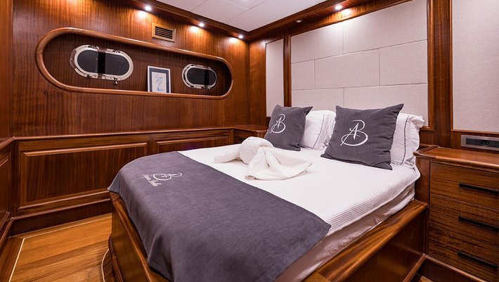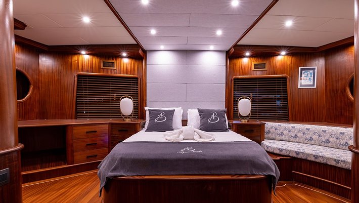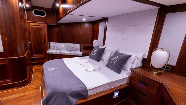 5 camarotes dobles: 1 master, 2 con cama matrimonio, 1 triple y 1 con camas individuales. Baño en cada camarote con ducha.