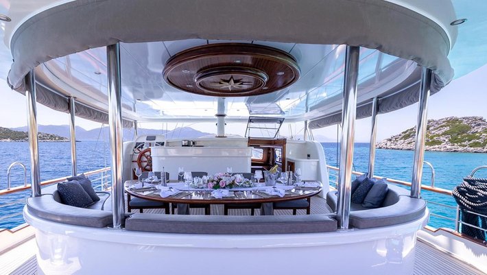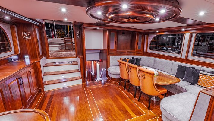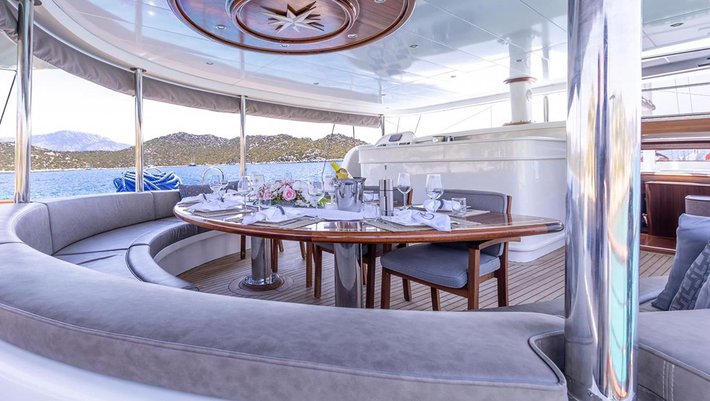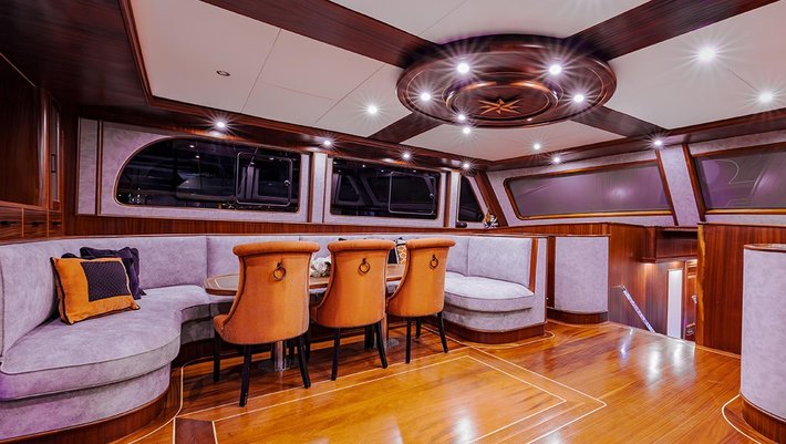 Amplia zona en popa con sofá de relax y comedor.