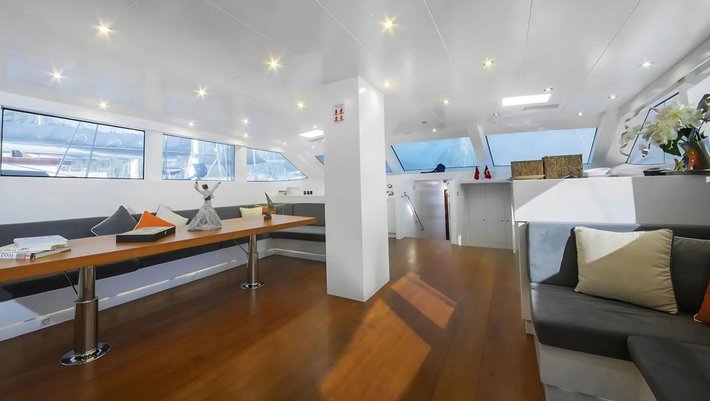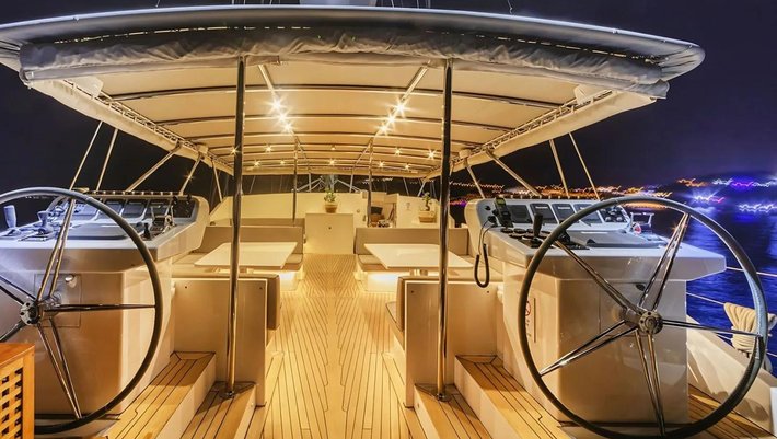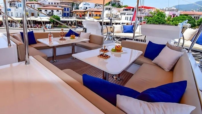 En su elegante popa se encuentra el comedor exterior y un gran sofá de relax.