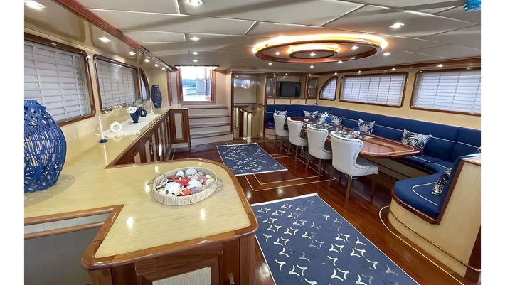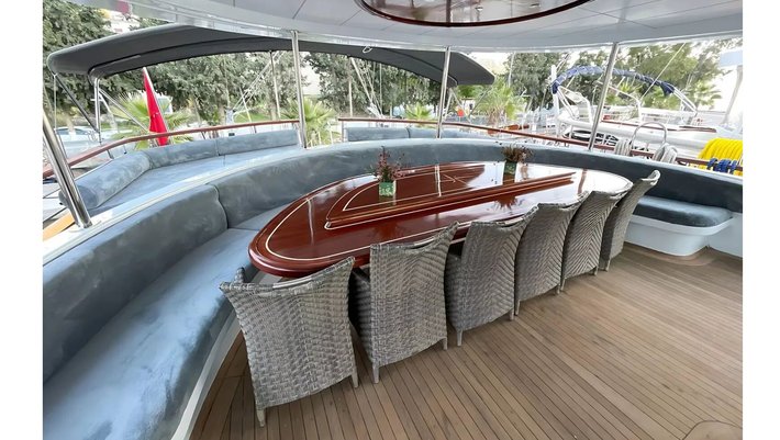 La zona de comedor exterior se encuentra en popa así como un gran sofá de relax.
