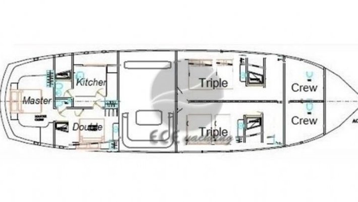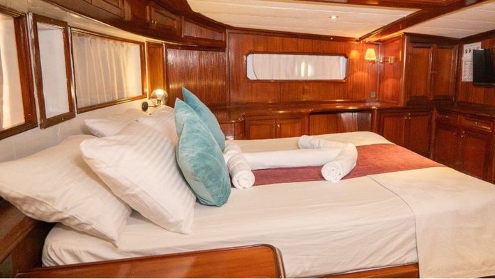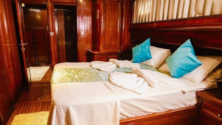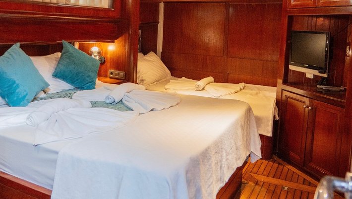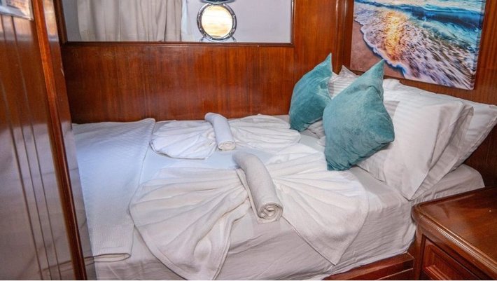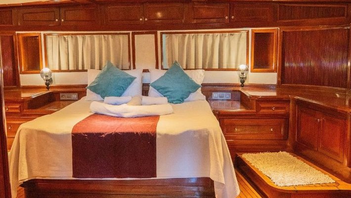 4 camarotes dobles: 1 master , 2 triples con cama de matrimonio + camaindividual y 1 con camas individuales, todas con baño en-suite y aire acondiconado independiente y cuarto de baño. Capacidad máxima 10 personas