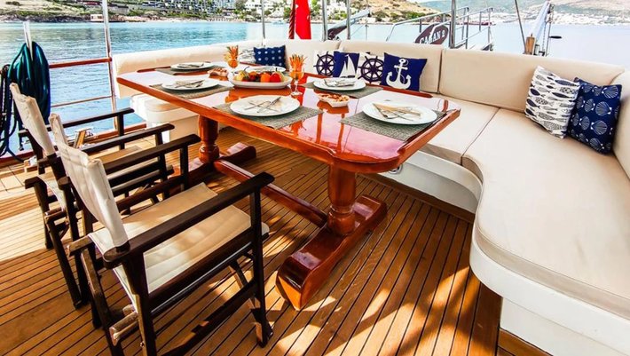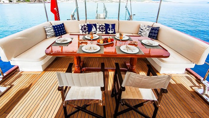 Dispone de comedor exterior en popa con gran sofá de relax que ocupa toda el ancho del barco.