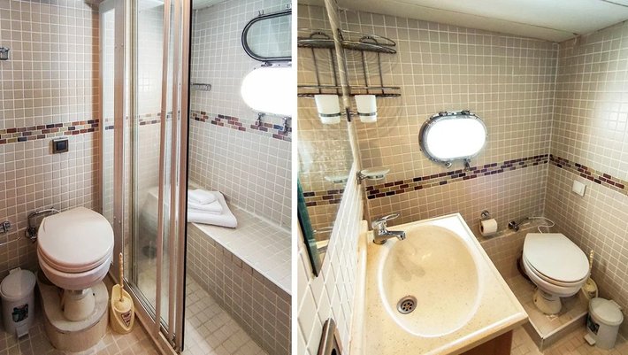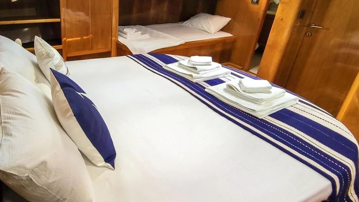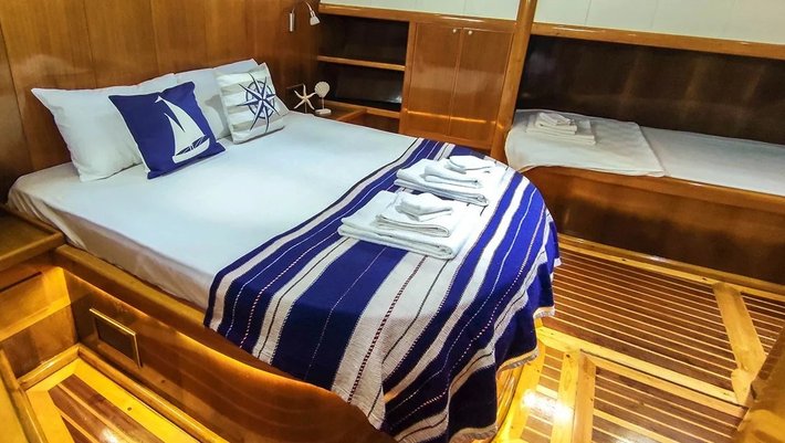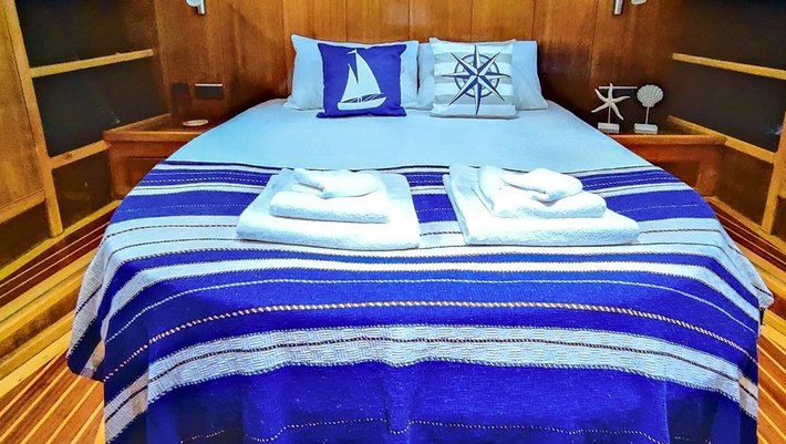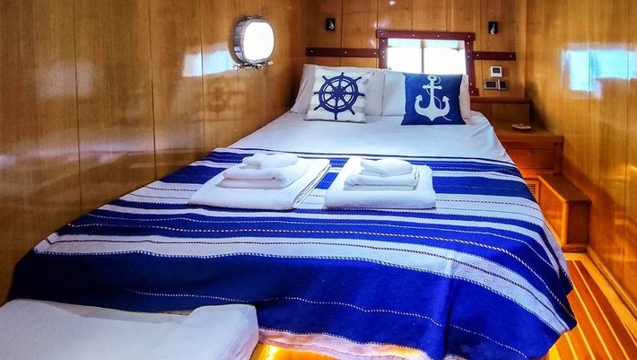 3 camarotes dobles: 1 principal, 2 dobles, todos con baño en-suite y aire acondicionado. Capacidad máxima 6-7 personas