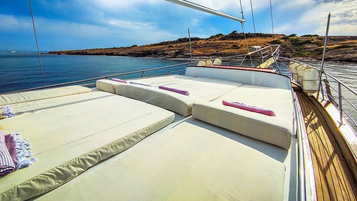 El solarium se encuentra situado en la proa del barco, con confortables colchonetas de sol. Sofá en proa con mesita ideal para tomar el aperitivo.