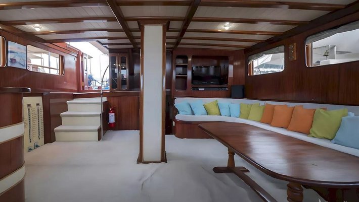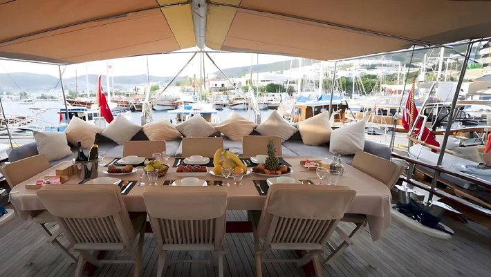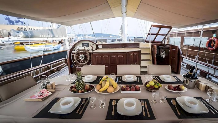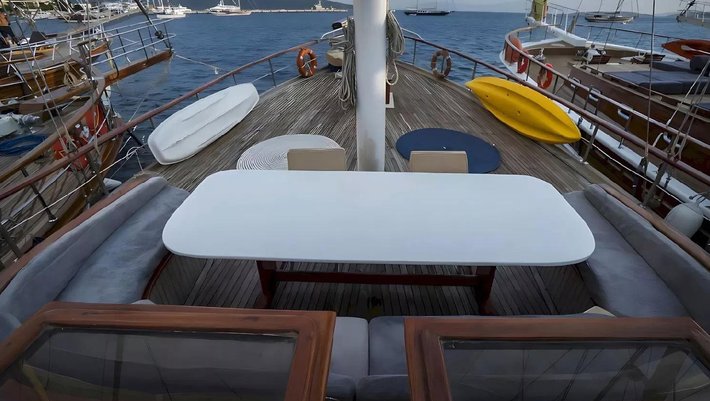 Dispone de 2 zonas de comedor, interior y exterior que se situa en popa con mesa y silla para 8 personas.
