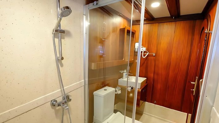 8 cabinas dobles: 6 con cama doble y 2 con camas individuales. Baño en cada camarote