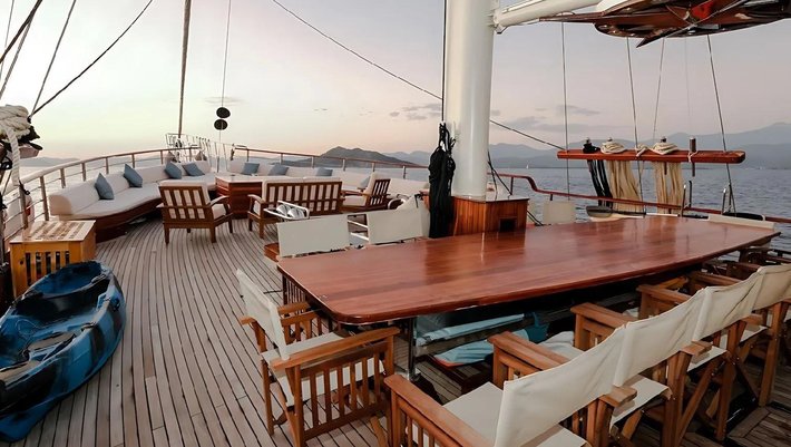 Amplia zona en popa de comedor con mesa y sillas para 16 personas y gran sofa de relax.